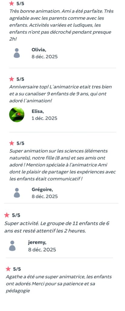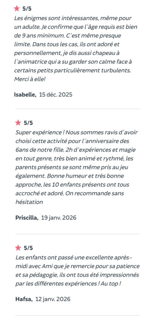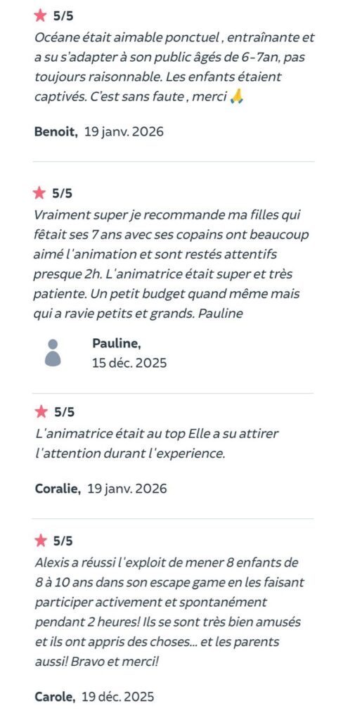 Chez notre partenaire principal FunBooker, nous sommes dans le top 5 des avis positifs parmi plusieurs centaines d’autres prestataires. Au 28/01/2026 nous avons dépassé les 400 commentaires à 5 étoiles sur 5 ! – Avis certifiés : seules les familles ayant eu une prestation peuvent faire un retour –