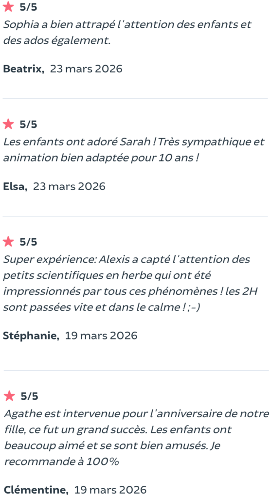 3 H – un thème de votre choix + petites expériences bonus + animations supplémentaires (si structure scolaire : jeux de plein air / si anniversaire : jeu des cadeaux + aide au goûter / etc.)